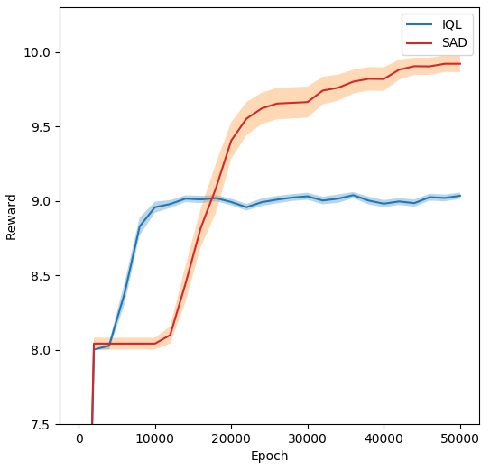 import numpy as np import matplotlib.pyplot as plt import torch import torch.nn as nn import torch.optim as optim from IPython import embed # payoff values payoff_values = [ [[[10, 0, 0], [4, 8, 4], [10, 0, 0]], [[0, 0, 10], [4, 8, 4], [0, 0, 10]]], [[[0, 0, 10], [4, 8, 4], [0, 0, 0]], [[10, 0, 0], [4, 8, 4], [10, 0, 0]]] ] payoff_values = np.array(payoff_values) n_cards = 2 n_actions = 3 bs = 32 if __name__ == '__main__': seed = 42 vdn = 0 final_epsilon = 0.05 n_runs = 50 n_episodes = 50000 n_readings = 25 np.random.seed(seed) torch.manual_seed(seed) mode_labels = ['','', 'IQL', '', 'SAD', '' ] all_r = np.zeros((6, n_runs, n_readings + 1)) interval = n_episodes // n_readings for n_r in range(n_runs): print('run ', n_r, ' out of ', n_runs) for bad_mode in [2, 4]: print('Running for ', mode_labels[bad_mode]) input_size = n_cards * n_actions ** 2 net0 = nn.Sequential( nn.Linear(input_size, 32), nn.ReLU(), nn.Linear(32, n_actions), ) net1 = nn.Sequential( nn.Linear(input_size, 32), nn.ReLU(), nn.Linear(32, n_actions), ) optimizer = optim.Adam( [ {'params': net0.parameters()}, {'params': net1.parameters()}, ], lr=0.001, ) greedy = 1 if bad_mode > 3 else 0 for j in range(n_episodes+1): cards_0 = np.random.choice(n_cards, size=(bs)) cards_1 = np.random.choice(n_cards, size=(bs)) eps = 0 if j % (interval) != 0: eps = max(final_epsilon, 1 - 2 * j / n_episodes) with torch.no_grad(): joint_in1 = cards_0 * n_actions**2 input_0 = np.eye(input_size)[joint_in1] input_0 = torch.from_numpy(input_0).float() q_vals = net0(input_0) qv0, qv0_i = q_vals.max(1) probs = q_vals * 0 + eps / n_actions probs += (1 - eps) * torch.eye(n_actions)[qv0_i] u0 = probs.multinomial(1).view(-1) u0_greedy = probs.max(1)[1] q0 = (q_vals * torch.eye(n_actions)[u0]).sum(1) # q0_greedy = (q_vals * torch.eye(n_actions)[u0_greedy]).sum(1) joint_in1 = cards_1 * n_actions**2 + \ u0.numpy() * n_actions + \ u0_greedy.numpy() * greedy input_1 = np.eye(input_size)[joint_in1] input_1 = torch.from_numpy(input_1).float() q_vals = net1(input_1) qv1, qv1_i = q_vals.max(1) probs = q_vals * 0 + eps / n_actions probs += (1 - eps) * torch.eye(n_actions)[qv1_i] u1 = probs.multinomial(1).view(-1) u1_greedy = probs.max(1)[1] # q1 = (q_vals * torch.eye(n_actions)[u1]).sum(1) q1_greedy = (q_vals * torch.eye(n_actions)[u1_greedy]).sum(1) rew = [ payoff_values[cards_0[i], cards_1[i], u0[i], u1[i]] for i in range(bs) ] rew = torch.from_numpy(np.array(rew)).float() q0 = net0(input_0)[torch.arange(0, bs).long(), u0] q1 = net1(input_1)[torch.arange(0, bs).long(), u1] optimizer.zero_grad() loss = (((rew + q1_greedy * vdn) - q0) ** 2).mean() + ((rew - q1) ** 2).mean() loss.backward() optimizer.step() net0, net1 = net1, net0 if eps == 0: all_r[bad_mode, n_r, int(j / interval)] = rew.mean().item() print(j, 'rew', rew.mean().item(), 'loss', loss.item() ) mode_labels = ['', '', 'IQL', 'IQL+aux', 'SAD', '' ] colors = ['','','#1f77b4','','#d62728'] plt.figure(figsize=(6, 6)) x_vals = np.arange(n_readings+1) * interval for bad_mode in [2, 4]: vals = all_r[bad_mode][:n_r+1] y_m = vals.mean(0) y_std = vals.std(0) / (n_runs**0.5) plt.plot(x_vals, y_m, colors[bad_mode], label=mode_labels[bad_mode]) plt.fill_between(x_vals, y_m+y_std, y_m-y_std, alpha=0.3) plt.ylim([7.5, 10.3]) plt.legend() None plt.xlabel('Epoch') plt.ylabel('Reward') plt.savefig('matrix_game.png') plt.clf()